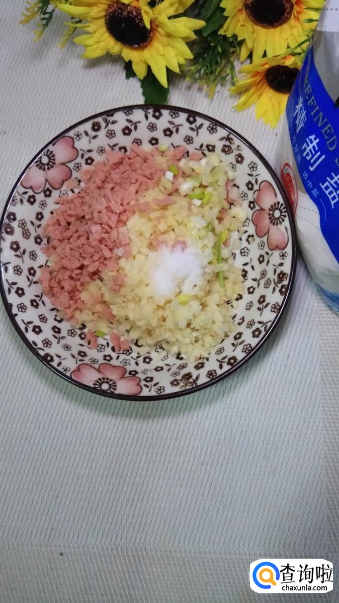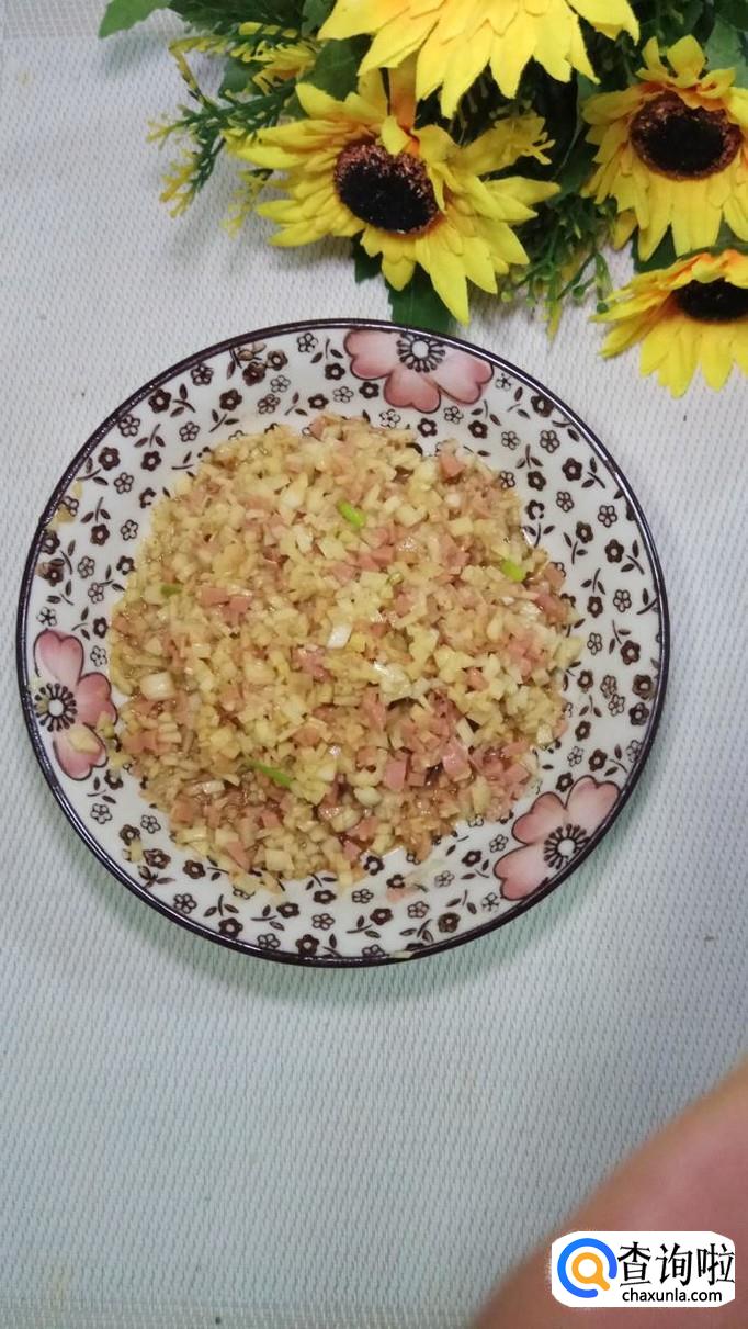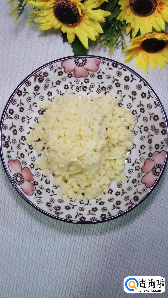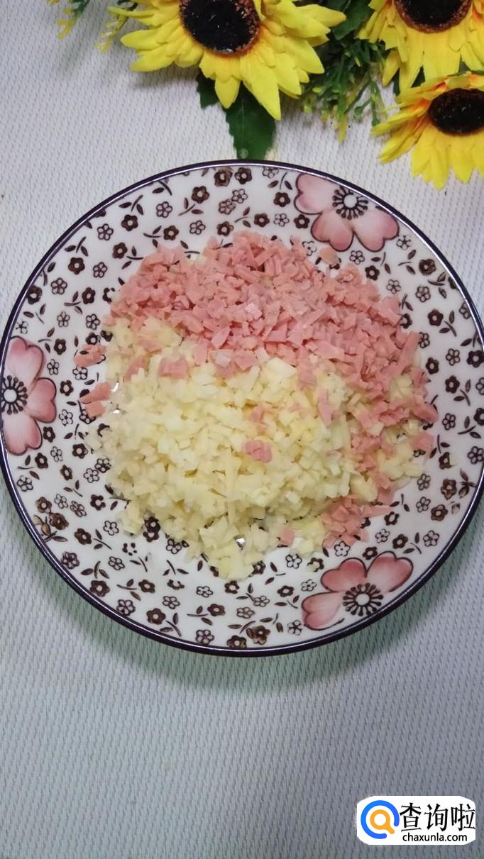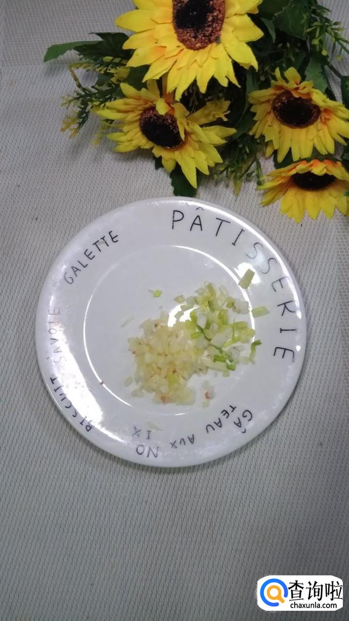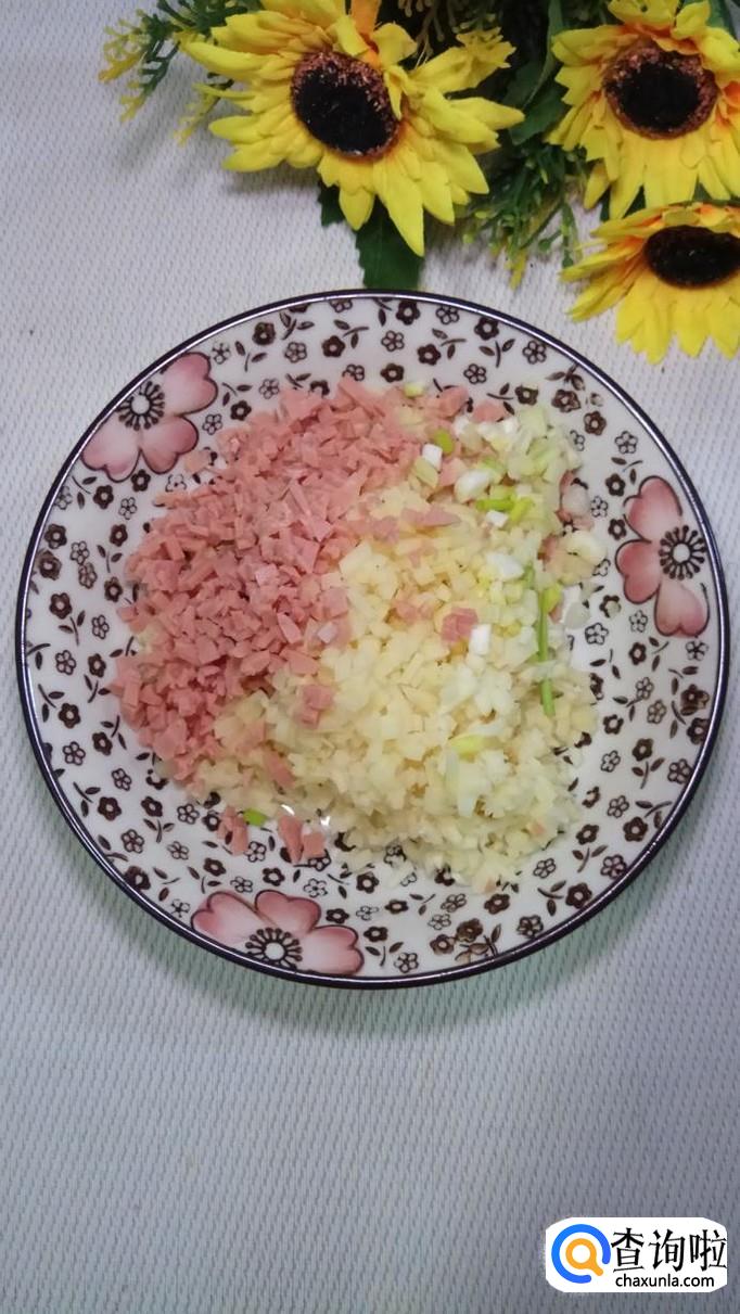 将土豆丁和香肠丁放在一起,然后再准备适量小葱和蒜,切碎后,放在盘中,搅拌均匀备用。