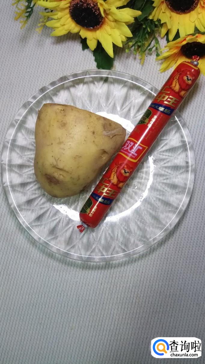 准备一个鲜嫩的西葫芦,再准备适量土豆和一根香肠。