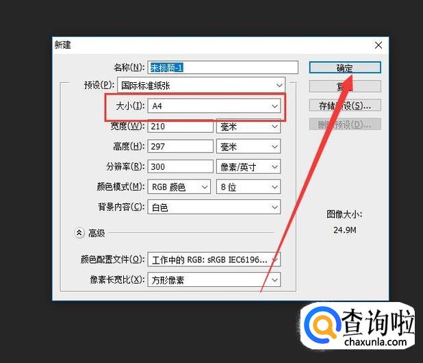 将大小设置为A4,点击“确定”即可,如图所示。