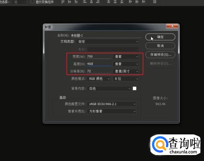 打开PS软件主界面,我们为其创建新的画布,尺寸设为:700×460,将分辨率:72像素/英寸)。