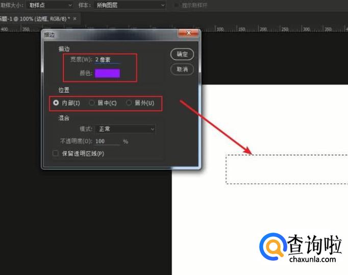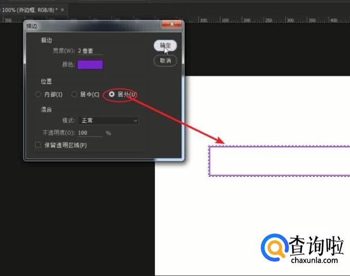 在弹出的窗口,将描边宽度设为:2px,颜色:紫色,位置:内部。