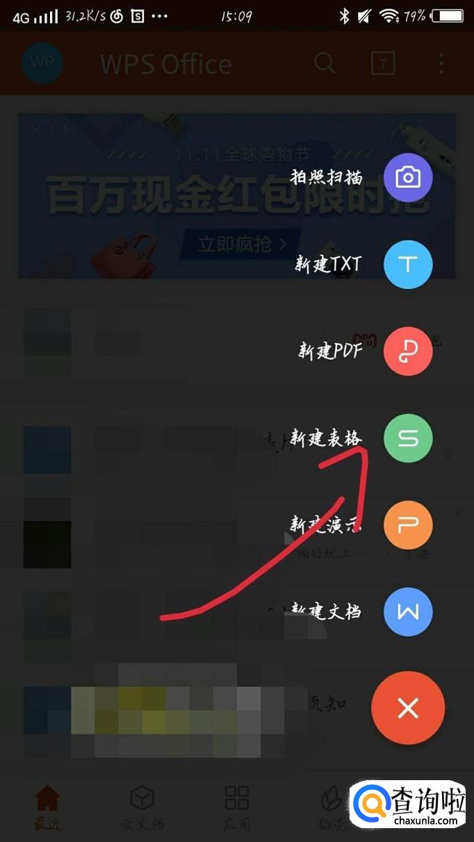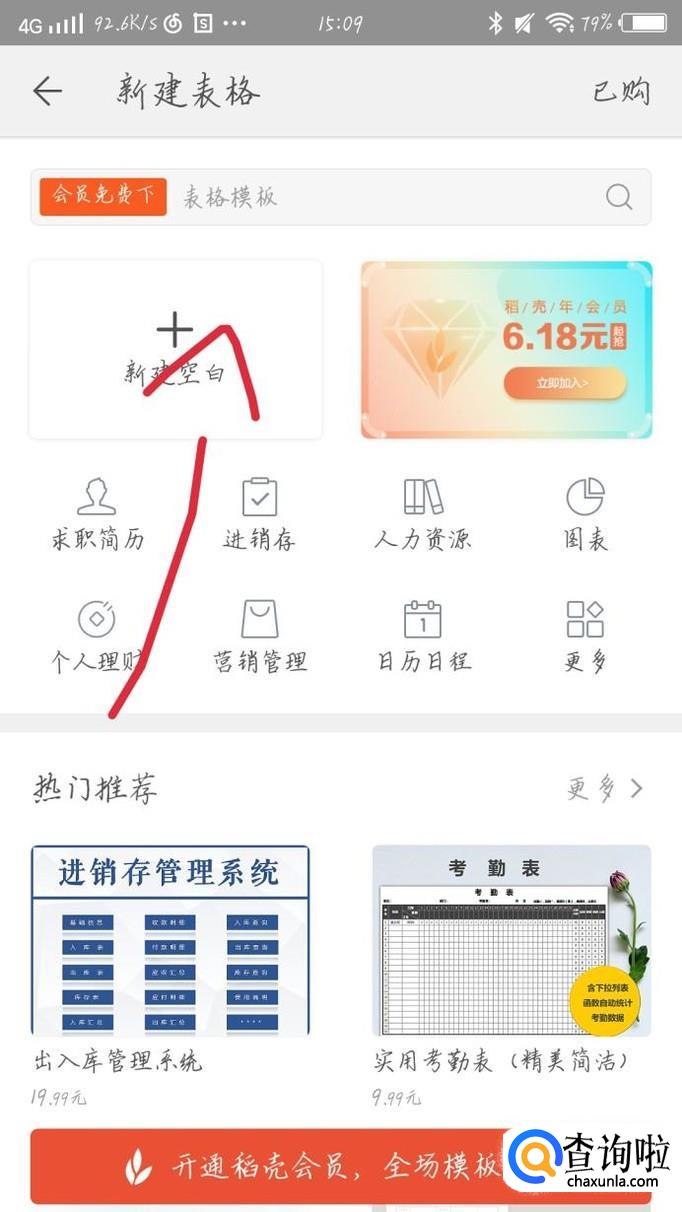 点击“新建表格”选项,如图1箭头所示。会出现一个新的界面,点击“新建空白选项”如图2箭头所示。