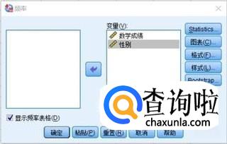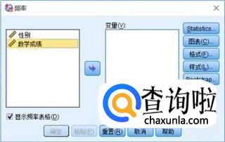 将对话框里的“性别”和“数学成绩”选入“变量”内,点击右边的”Statistics"按钮。