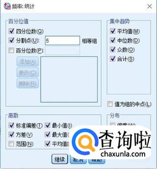在统计对话框勾住想要显示的变量,比如“平均数”、“众数”等,点击“继续”,在主对话框中点击“确定”。