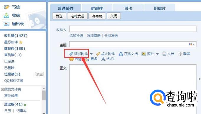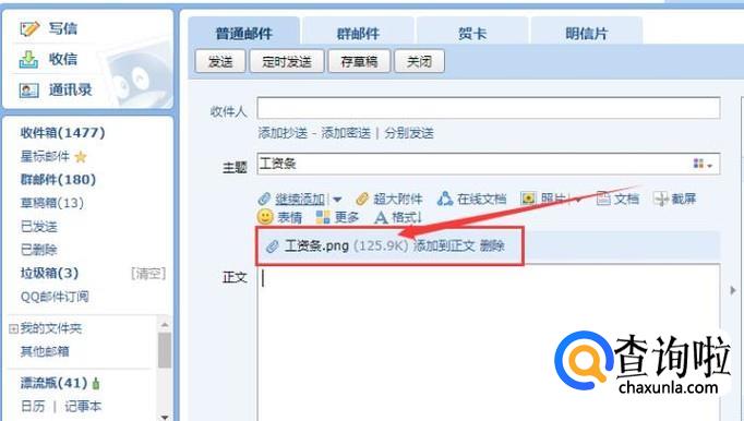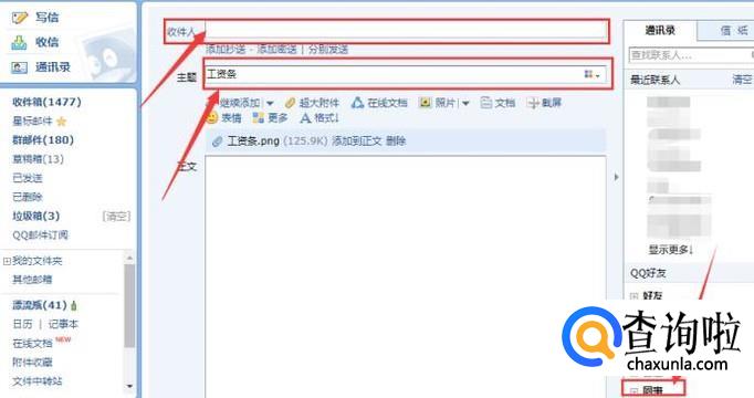 接着,输入邮件主题,比如工资条,在收件人那一栏添加收件人,如果你的同事都在你的QQ好友里面,那么直接点击如图所示的QQ好友,将所有的同事的邮箱添加进去。