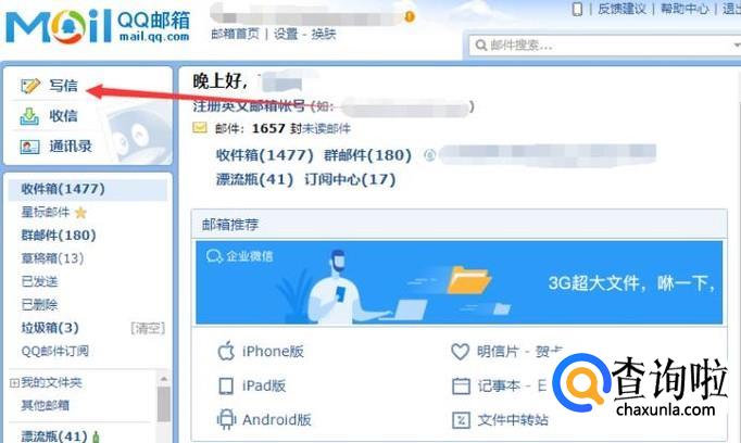 小编以QQ邮箱为例,首先,我们打开QQ邮箱,点击”写信“,如图所示。