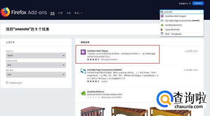 在附加组件管理页面(Add-ons),搜索OneNote Web Clipper。如图搜索结果的第一个,就是Microsoft官方的OneNote插件。