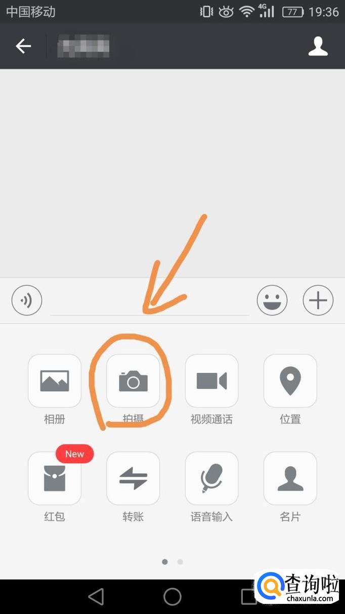 在发消息页面的消息栏处,点击十字图标,然后在出来的菜单中点击拍摄。