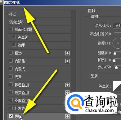 打开图层样式的设置面板,在面板的左下方这里勾选:投影;鼠标再点击一下投影。