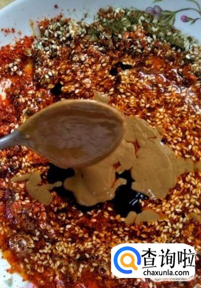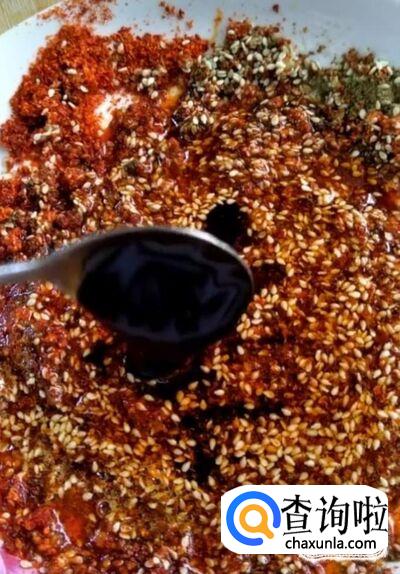 然后我们在盘中放入适量的辣椒面,孜然粉,芝麻,再加入适量的盐,鸡精,白糖调味