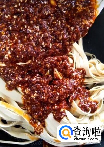 最后我们将搅拌好的料汁浇在豆腐皮上面,抓拌均匀,美味的油泼干豆腐皮就制作完成啦!