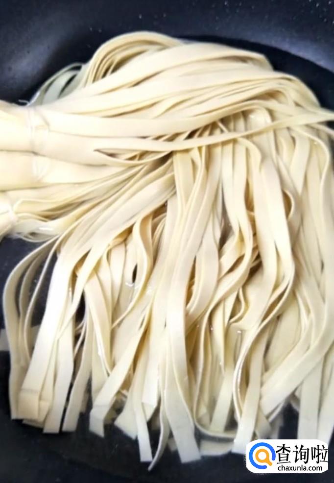 首先我们将干豆腐皮改刀切成条,放入热水锅中焯一下捞出,过凉控水备用