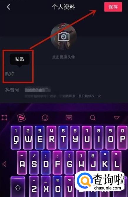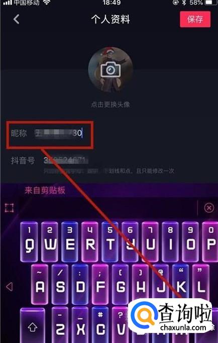 然后我们点编辑资料,开始编辑我们的名字,我们把原来的名字删掉,再把复制的空白粘贴,再保存,可以看到我们的昵称已经变成空白了。