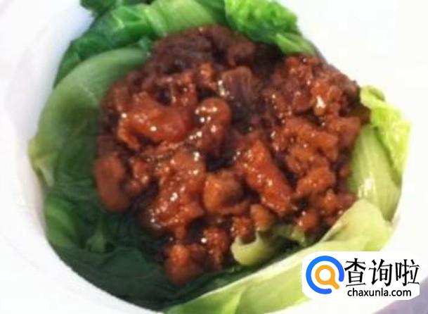 然后准备好生菜叶,把炒好的肉末舀一勺在生菜叶里。然后在生菜叶上的肉末淋上一层我们调好的酱汁,美味的红椒牛肉生菜卷就完成了