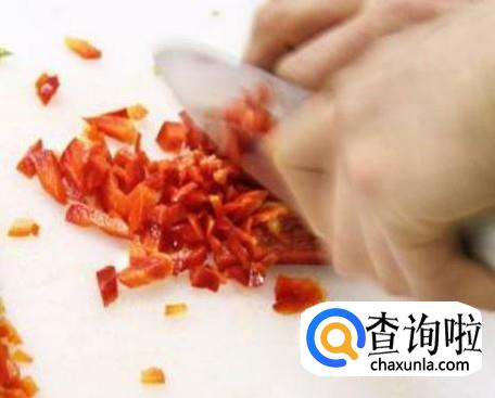 把准备好的红椒切成小丁状,然后放点盐在红椒上,等下好入锅和肉末一起炒