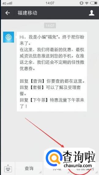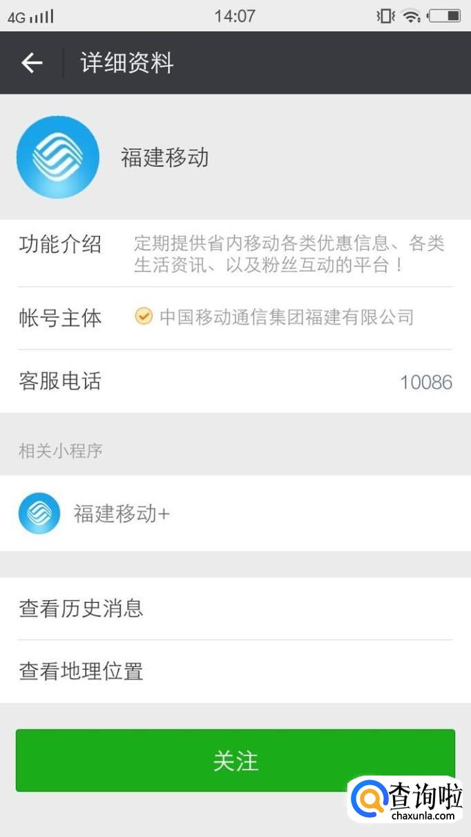 选择手机所在地的公众号,比如XX省份移动、XX市移动都可以,比如搜索【福建移动】然后点击【关注】,如下图所示: