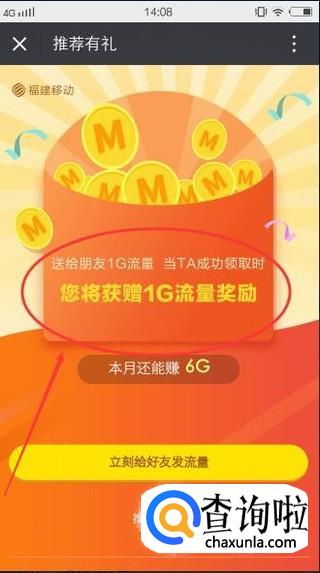 然后发送给朋友,当他领取1G的流量,你就可以领取1G了,一个月可以发给6个朋友。不过才6G,最好别发了,别人给我发这种,我直接拉他去黑名单了。