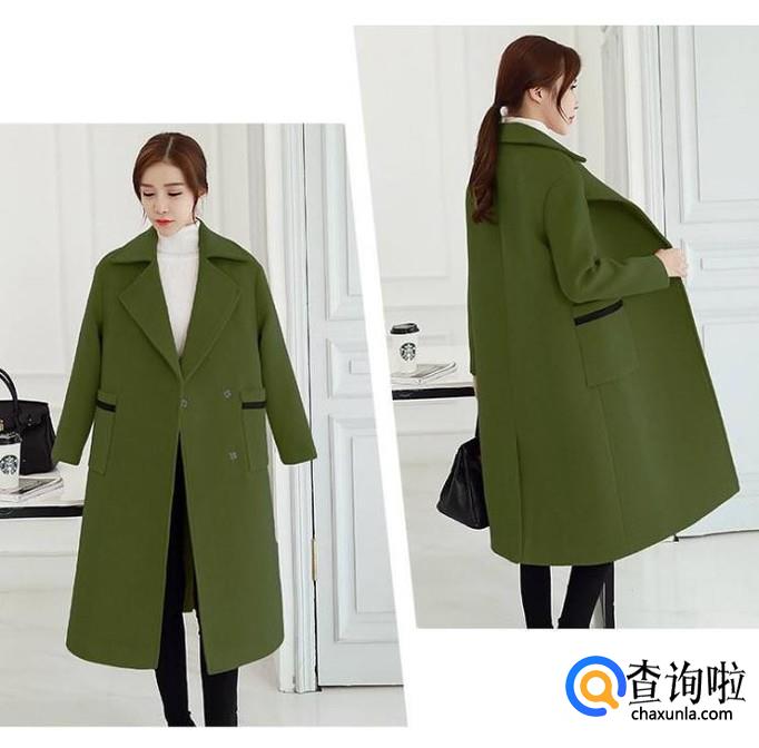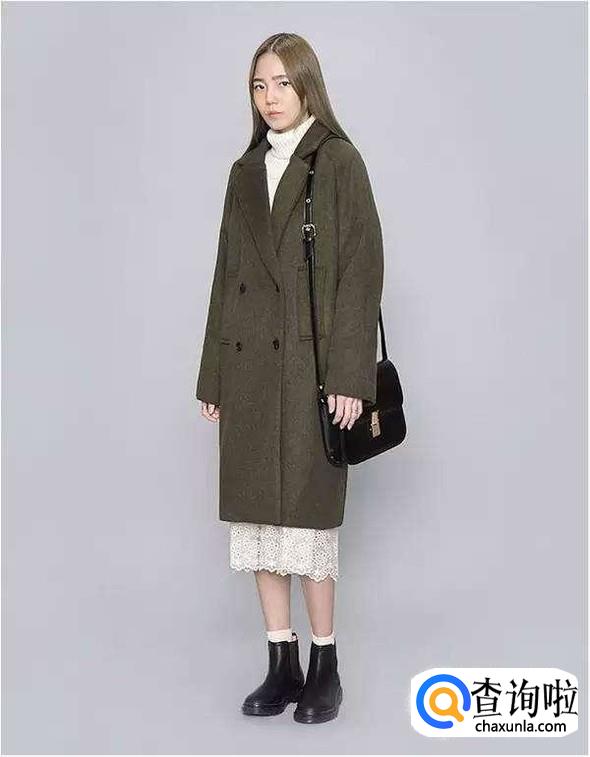 军绿色大衣里面搭配一件浅灰色的毛衣,下面再配一条黑色的打底裤,再加上一个黑色的小皮包点缀,整个人都显得非常有气质。