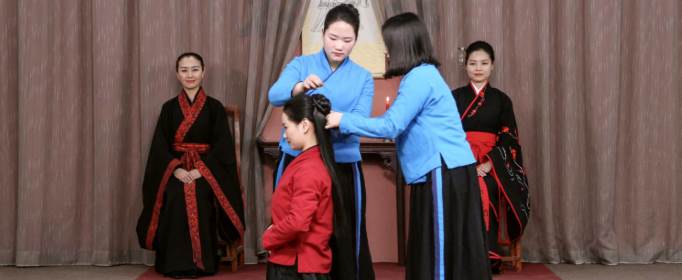 受笄即在行笄礼时改变幼年的发式,将头发绾成一个髻,然后用一块黑布将发髻包住,随即以簪插定发髻。主行笄礼者为女性家长,由约请的女宾为少女的加笄,表示女子成年可以结婚。贵族女子受笄后,一般要在公宫或宗室接受成人教育,授以“妇德、妇容、妇功、妇言”等,作为媳妇必须具备的待人接物及侍奉舅姑的品德礼貌与女红劳作等技巧本颂。后世改为由少女之母申以戒辞,教之以礼,称为“教茶”。女子年十五岁,则称为“及笄”。《仪礼.士婚礼》:“女子许嫁,笄而礼之,称字。”《礼记.内则》“女子......十有五年而笄。”