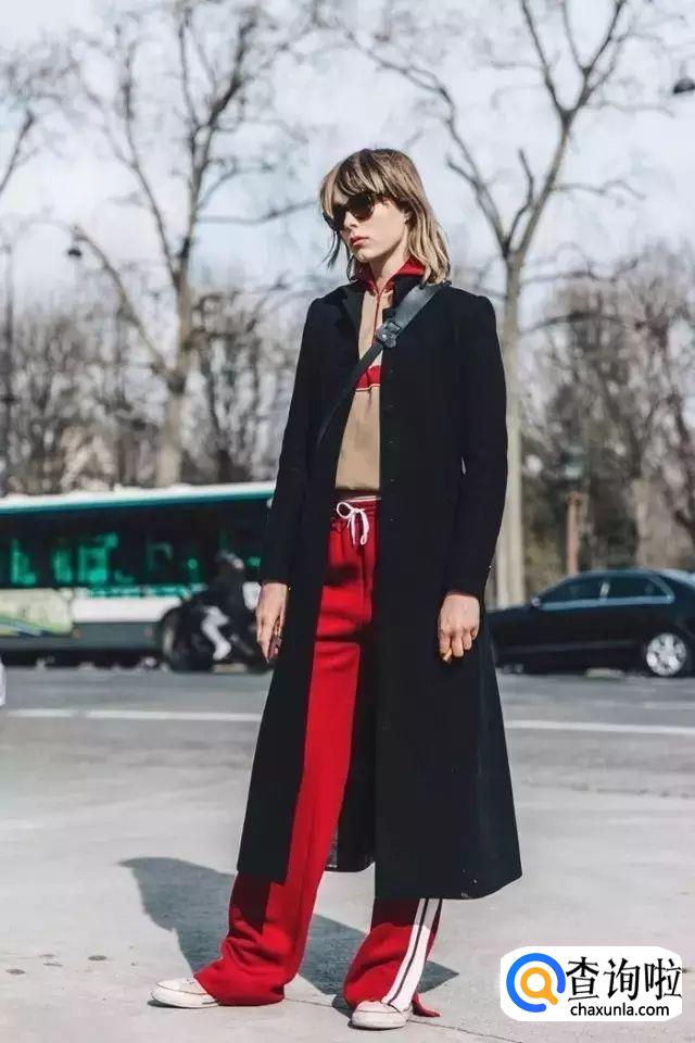 想要亮眼些,黑色外套搭配什么裤子选择红色裤子就很好看了。驼色卫衣搭配侧条纹的红色运动裤,外搭一款黑色长款大衣,让你出街吸睛满满。