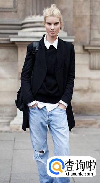 像米兰儿可儿这样黑色上衣搭配一条深蓝色牛仔裤就十分的气质和显瘦哦,鞋子再选择十分chic的黑色及膝长靴,分分钟打造完美腿型。在炎热的夏季,也可以选择搭配一双黑色罗马系带凉鞋或黑色浅口高跟鞋,同样的时髦不减。