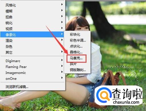 画出选区之后我们在滤镜菜单哪里找到像素化选项,点击该选项在其内找到马赛克选项,如图所示: