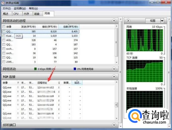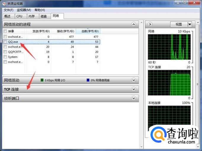 进入资源监视器,再点击网络选项卡,点击QQ.exe,点击TCP连接。