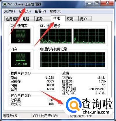 在任务管理器中点击性能选项卡,再点击右下角的资源监视器。
