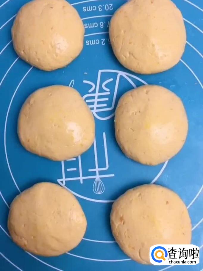 接着把糯米粉分成大小均匀的几个剂子并按扁,如下图所示。小贴士:大家在做南瓜饼的过程当中可以在手上沾一些茶油或者是食用油,这样做能够很有效的防止糯米粉粘手。有兴趣的小伙伴可以尝试一下。