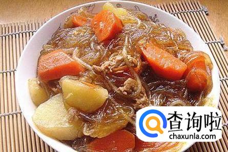土豆、红萝卜、红薯粉丝、猪肉、姜、蒜、葱适量,生抽、料酒适量。