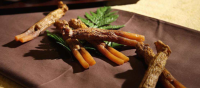 红参实则为人参的熟用品,是经过浸润、清洗、分选、蒸制、晾晒烘干等工序后制成的。其表面呈红棕色、半透明的状态,表面长有皱纹和细跟痕,上部分有断续且不明显环纹,其下部有扭曲交叉的支根且长有许多的须。红参的气味有一点香、味甘微苦。功效:大补元气,补益脾肺,生津安神。作用:用于气虚欲脱,脉微欲绝的重危证候。无论大失血、大吐泻或久病、大病所致者,单独用人参浓煎,具有大补元气,复脉固脱的作用。