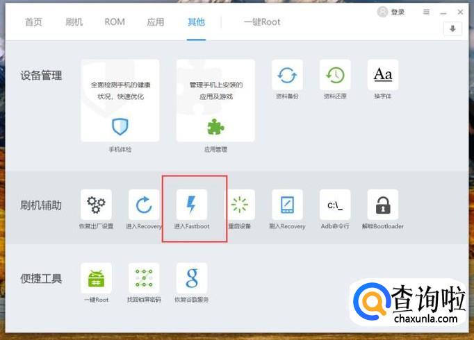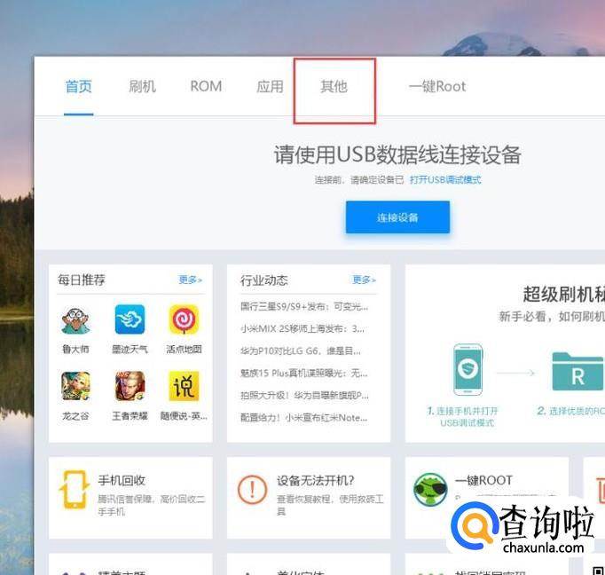 除了利用手机自身的功能按键可以进入快速启动模式之外,还可以利用一些第三方工具来实现,如刷机精灵软件,使用USB数据线连接手机与电脑,打开软件主页面,点击“其他”菜单选项。