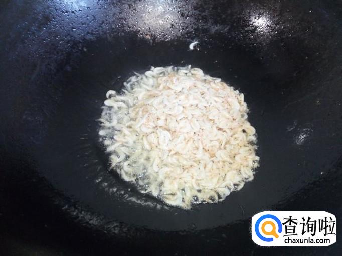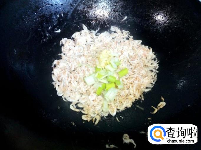 锅里放入油加热,油热后放入虾皮,小火翻炒,炒至虾皮出香味,放入葱,姜翻炒。