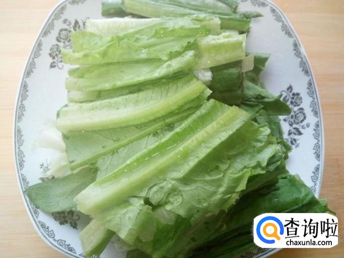 油麦菜收拾清洗干净,控干水分,切成段。