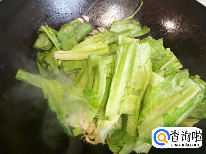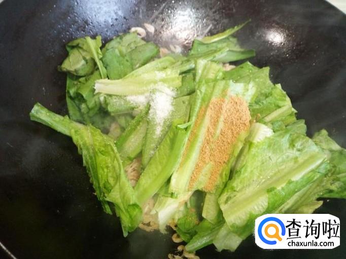 随即放入油麦菜,放入五香粉,盐(不是脱盐的虾皮,要慎重放盐),转大火翻炒。