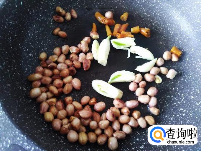 炒至脆香后下油,放蒜米、小米辣下去翻炒一下。