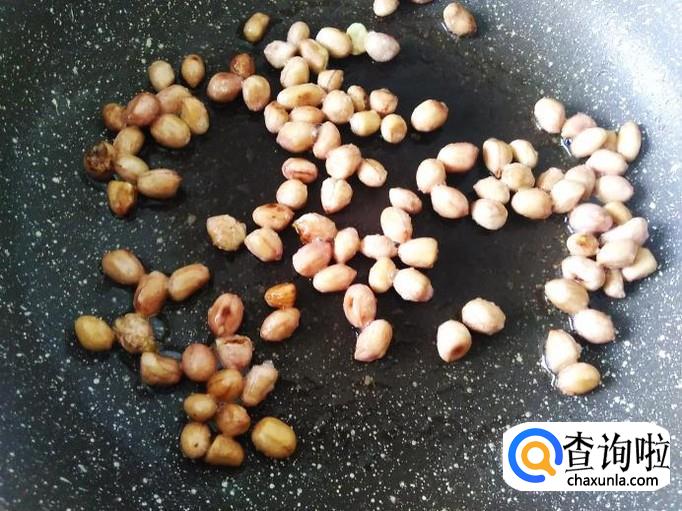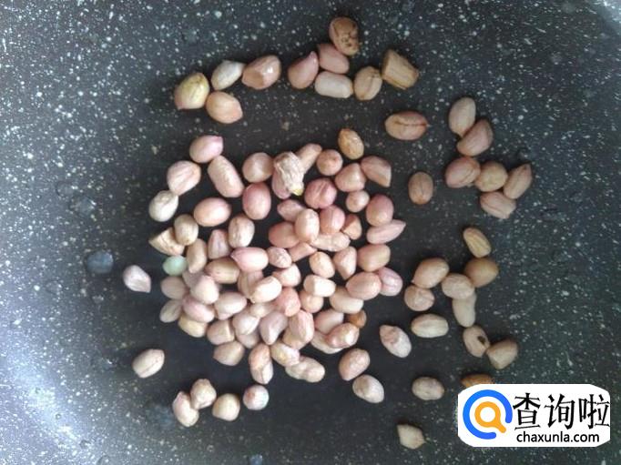 开火放花生进锅,用小火翻炒。