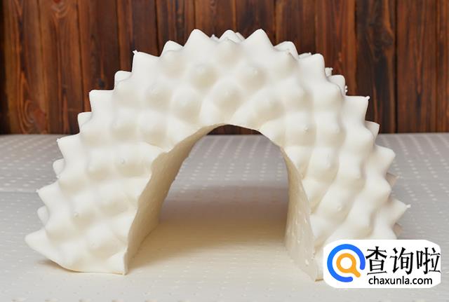 乳胶枕的韧性,乳胶枕有软一些的和硬一些的密度差别,40D和45D这样的,还有不同的款式,一般都是波浪的、面包的或者颗粒的。不论是什么形状什么密度,乳胶枕的回弹性都是很好的,回弹性是很不错的,当你的手按压在乳胶枕上,压下去的时候松手,正常乳胶枕是会快速回弹的。当你捏了一小部分的乳胶向外拉扯的时候,好的乳胶是要断不断的,你还可以看到被拉扯放大的气孔。如果是一拉就断的,或者直接就有碎渣的,那可能是乳胶原液的含量不足的原因。