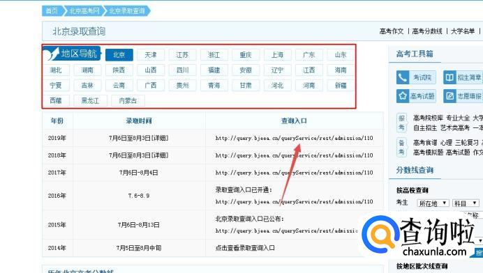 进入界面后,在上方“地区导航”中,选择你想要查询的地区。然后点击右面的“查询入口”下的网址链接。
