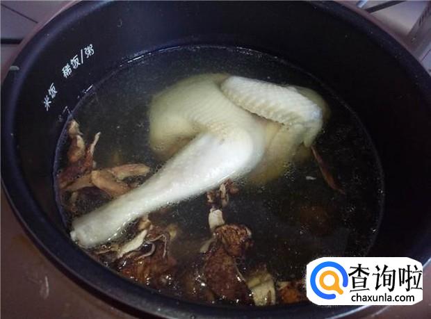 煮开后把半边鸡放进锅里,再把清洗好的野蘑菇一起放进去炖。