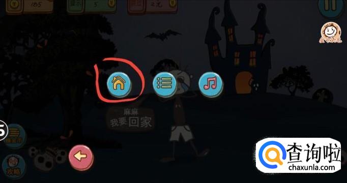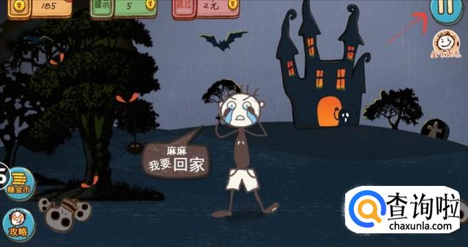 不能去点鬼和蜘蛛,否则他会被吓死。要想顺利通关,首先,我们点击右上方的暂停按钮,然后点击类似房子的那个图标,然后他就可以回家了!