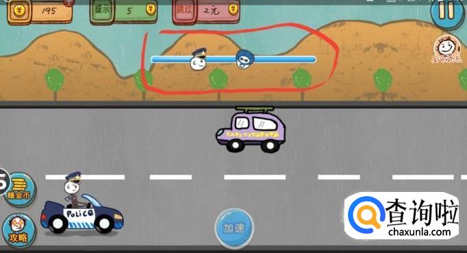 不能点加速,因为后面会跟别的车撞上。只需要拉动上方的进度条,让警察追上小偷。
