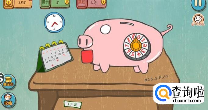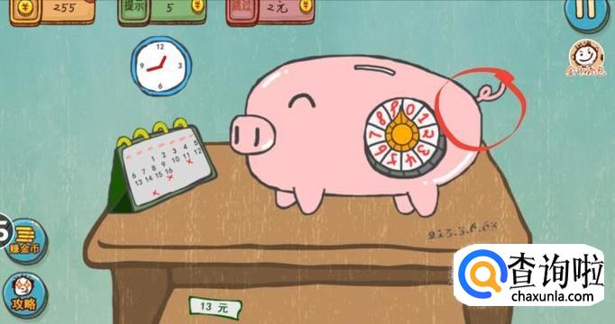 这一关不要妄想用密码打开存钱罐。我们要先点一下猪尾巴,然后猪嘴巴就会张开,再将手机向左倾斜,钱就被抖出来了。