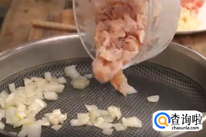 在烤盘里铺满米饭,再倒入炒好的鸡胸肉。