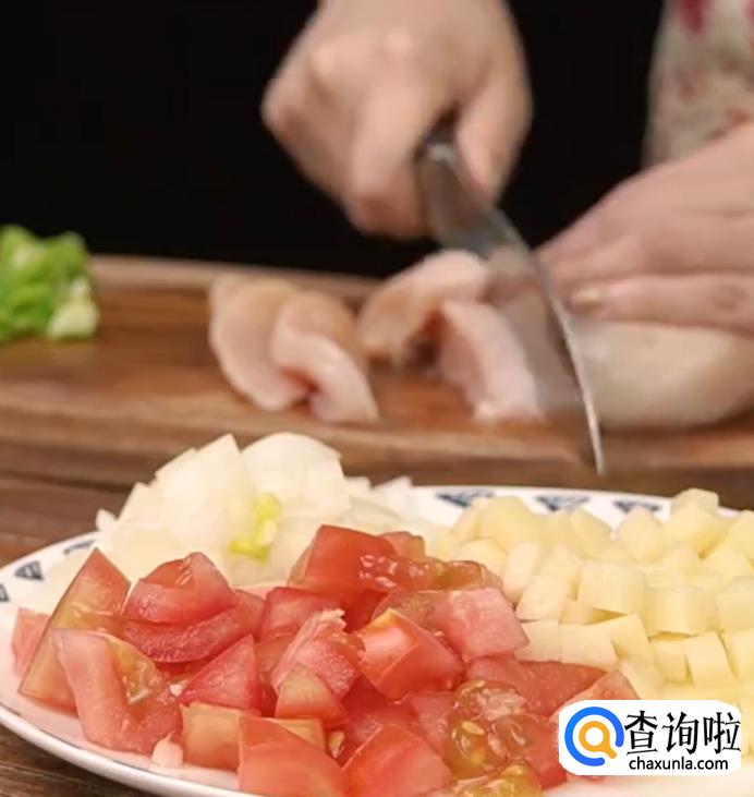 依次放入鸡胸肉,土豆,西红柿炒香。