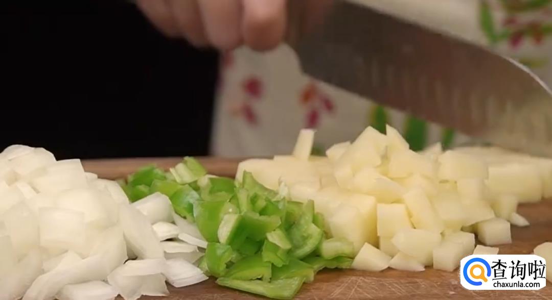 米饭、西红柿、洋葱、土豆、芝士片、青椒、鸡胸肉、生粉、橄榄油、黑胡椒、盐、生抽