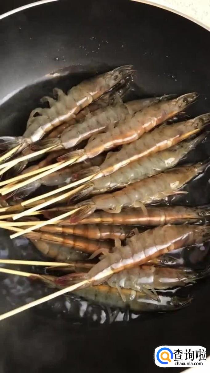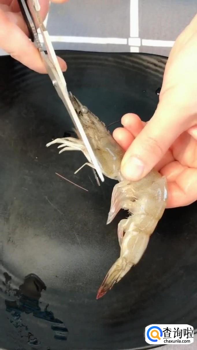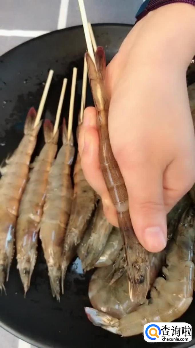 然后用剪刀剪去虾的脚并用一根竹签刺入虾的身体,如下图所示。这样做能够防止虾身受热扭曲。