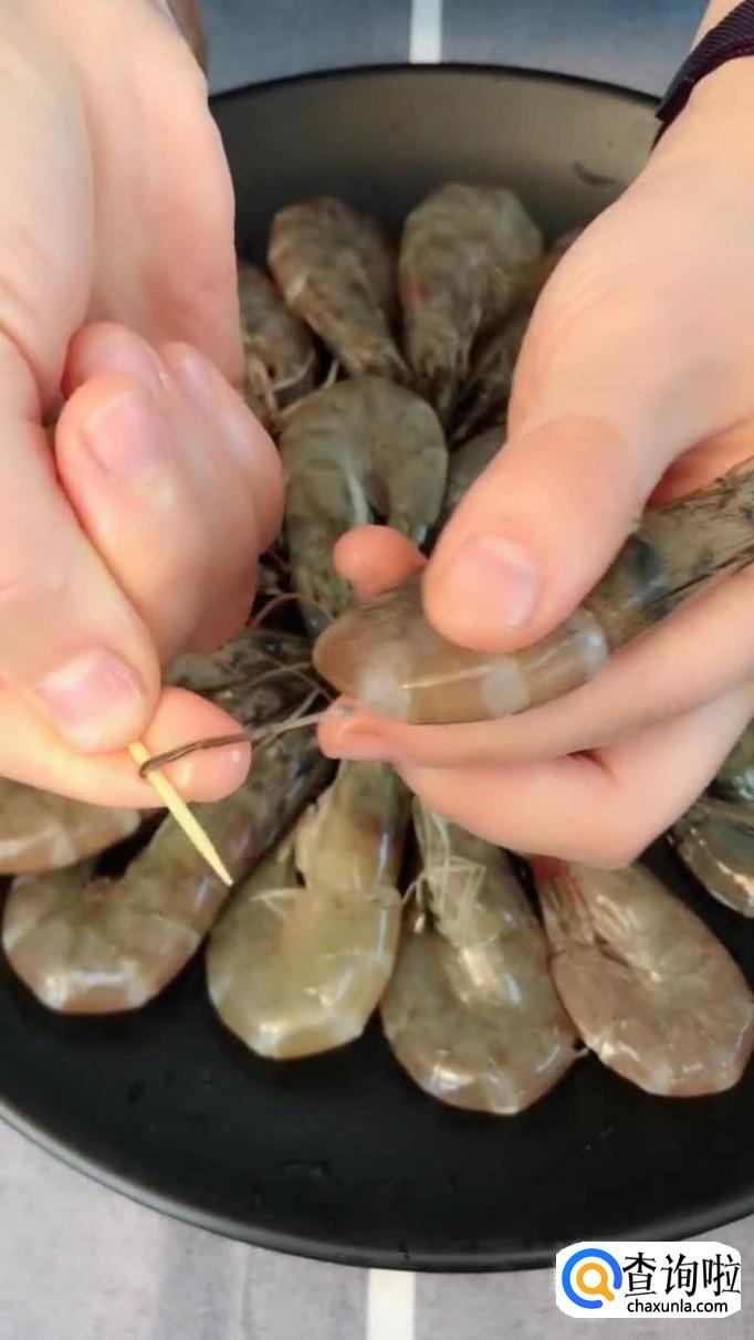 首先用一根牙签在虾第三个关节处刺进去挑出虾线,如下图所示。