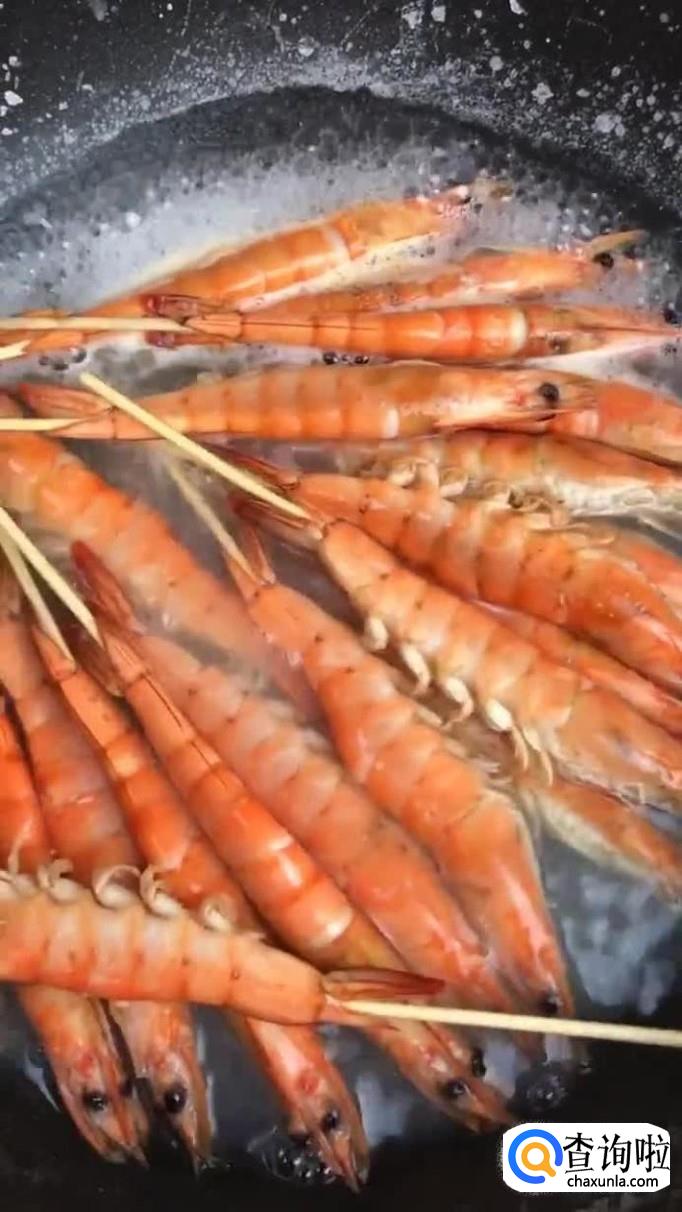 接着把虾放进盐水中烫五分钟,如下图所示。