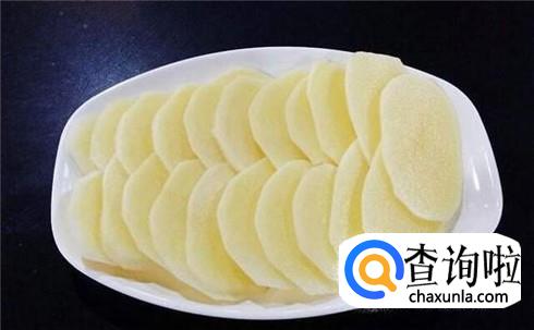 土豆削皮,清洗干净,切成薄片,平铺在碟子上。土豆也可以用南瓜代替。